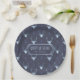 Esta placa de papel apresenta um padrão tendencial de silhuetas da cabeça de veados com curvas, setas estilizadas e pequenos flocos de neve em tons de azul-céu e ardósias sobre um fundo azul-marinho. Foi fornecido o texto "Feriados Felizes" opcional e um rótulo para adicionar o seu nome e/ou outro texto. Procure ID861 a ID864 para ver opções de cores adicionais e outros produtos neste conjunto de design de Natal moderno.