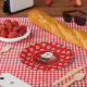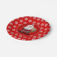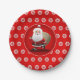 Estas placas de papel vermelhas festivas impressas com os flocos de neve redondos brancos grandes e um Papai Noel feliz que sneaking no meio com seu cheio do saco dos presentes são um dos ingredientes chaves de uma festa de Natal perfeita.