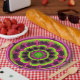 Cores neon brilhantes de verde e rosa formam um design simétrico semelhante a um mandala com padrões intrincados