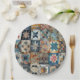 Aparece uma colcha colorida com uma variedade de padrões de retalhos, cada quadrado com designs e tecidos diferentes.