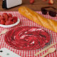 Um belo design de espiral preto branco-vermelho num padrão único que chama a atenção.