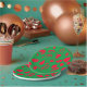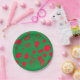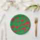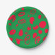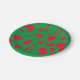 Esta placa de papel festivo apresenta linhas curvas e formas em vermelho sobre uma superfície verde.