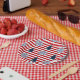 Design náutica com barco à vela e decoração de bússolas em fundo listrado vermelho e branco