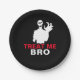 Uma silhueta branca de um zumbi ou monstro horrível, texto vermelho Trate-me, texto branco Bro. fundo preto. Engraçado prato de papel do Halloween para qualquer um. Personalizável. Você pode mudar a imagem e dois textos. Use o botão Personalizar para ajustar o produto às suas necessidades e desejos pessoais. Divirta-se.