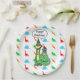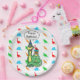 Uma mão bonita desenhou pratos de aniversário de dinossauros para a festa de aniversário temática de dinossauros de um menino. Vermelho, verde, azul e laranja.