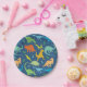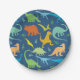 Teste padrão colorido da silhueta do dinossauro. Tiranossauro Rex, titanosaurs, Triceratop, raptores, Ankylosaurs, Dino-Pássaros, Stegosaurus, Apatosaurus, Pteranodon e mais em um teste padrão colorido no fundo azul, e dinossauros em verde, em azul, em amarelo e laranja.