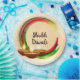 Diwali design apresenta três diyas em um laço marrom com aquarela e um círculo arco-íris colorido com aquarela.
