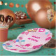Adicione um pouco de doçura à sua celebração com esta adorável placa de papel rosa! Apresentando uma princesa cisne fofa, rosquinhas, cupcakes, idiotas e sotaques doces coloridos, esta design divertida é perfeita para aniversários infantis, festas de meninas, ou qualquer celebração com tema doce. Uma maneira deliciosa de servir bolo e salgadinhos de festas enquanto mantém o tema mágico e festivo.