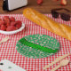 Brincadeiras, modernas peças brancas de dominó preto com fundo verde e uma faixa verde preta personalizada com seu nome, monograma, iniciais ou suas próprias palavras personalizadas. Presentes de dominó ideais para amantes de jogos.