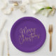 O texto feliz de Natal em rico chic em folha de papel azul é apresentado em pratos de papel roxo em dois tamanhos. CORRESPONDENDO a itens na nossa loja.
