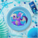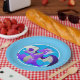 Chapas de papel azuis, brancas, com um dragão roxo pronto para desfrutar de uma fatia de bolo