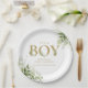 Chá de bebê É um menino prato de papel com elegante tipografia dourada e linda folhagem botânica verde. Projetado por Thisisnotme©