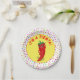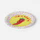 Chapas de papel personalizadas. Pimenta de pimenta bonita no estilo cartoon dizendo "É uma fiesta!". Confetti Pattern no fundo. Dar uma ideia para pessoas que amam comidas mexicanas e cultura.