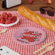 Palavra SMOOCH sobre corações vermelhos. Efeito de som cômico. Cor de fundo personalizada. Texto personalizado.