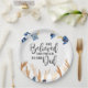 Este design apresenta uma pintura aquosa de mãos jogando bonés de formatura azuis no ar. Há uma variedade de tons de pele representados. O texto diz Ela acreditava que poderia e ela fez!