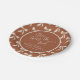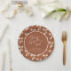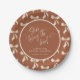 Pratos de Papel Personalizados Chuveiro de Noiva Ela Está Amarrando o Nó em Terracota + Paleta de Areia. Estilo de caligrafia manual elegante com um padrão de laço fofo. Basta personalizar o modelo com o título e a data do seu evento. © Kimbellished, LLC