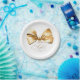 Pratos de papel para chuveirinho de noiva com laço dourado "Ela Está Amarrando O Nó"