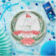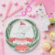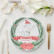 Este lindo design de papel de Elefante Branco apresenta um elefante de aquarela saindo de uma coroa de Natal. As palavras "O Primeiro Bebê" são escritas em branco, em uma faixa vermelha de fita, com o Natal logo abaixo.