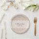 Personalize this Christian baptism paper plate for your special, faith-filled celebration. The design features a delicate cross in elegant soft beige pearl graphics, beautifully accented with beige lace and pearl graphic details against a soft pink beige background. Perfect for a minimalist christening, simple baby dedication, or baptism with a vintage look, this design combines timeless charm with modern simplicity. The mocha brown colored typography and graceful script font add a refined touch, making these paper plates a lovely addition to your event décor. Be sure to see the collection for matching items to complete your coordinated look.