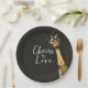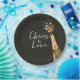 Chic wedding paper plates featuring a sleek black background with champagne gold accents and a celebratory champagne bottle illustration. Perfect for modern, upscale, or classic weddings, these plates add a sophisticated and stylish touch to your wedding table decor. Ideal for couples seeking a timeless and elegant detail for their special day.