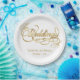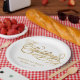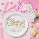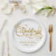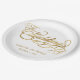 A formal, elegant white wedding paper plate with faux gold calligraphy script.