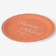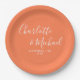 Pratos de papel personalizados de casamento coral com assinatura elegante com nomes em estilo de assinatura e a data do seu casamento. Concebido por Thisisnotme©