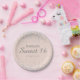 Placas de papel de cor rosa doce 16 com brilho prateado e uma fonte elegante de caligrafia/escrita. O fundo e a cor do texto destas placas de papel são completamente personalizáveis, por isso, design-os para a sua celebração.