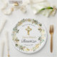 Celebre el autizo de su herbebé con con con humé con familiares y mientras ofreesto bonitos platos de papel de bautismo florales. Este diseño apresenta a una majestuosa cruz de oro adornada con rosas cor crema alreor de los platos de para una recepción de baupapel.