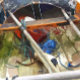 Design de arte de um pequeno barco a remos com equipamento de pesca.
