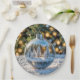 Um enfeite de vidro delicado reflete uma cena de neve, cercada por galhos verdes e luzes aquecidas e brilhantes