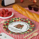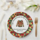 Placas de papel com um design de suéter de Natal vermelho, verde e ouro, triângulo vermelho, e ouro feio para coordenar com os convites da festa para uma festa de suéter terrível. Isto tem uma mensagem engraçada e um nome e data editáveis que você pode personalizar.
