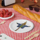 Um velho espantalho com um casal de pássaros amarelos. Este design parece realmente eficaz nestas placas de papel