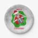Esta placa de papel tem um esqueleto sorridente segurando ornamentos vermelhos e verdes com flocos de neve até seus olhos vestindo um chapéu de Papai Noel vermelho como forma dimensional ondulada em um fundo branco com círculos de vários tamanhos. Personalize o texto Feliz Natal com os modelos.