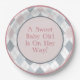 Placas de papel com padrão em branco, cor-de-rosa, e cinzas super bonitas e argyle coordenadas com o Baby Lambs Chá de fraldas Suite. O texto diz "Uma doce menina está a caminho" no centro.