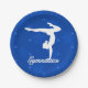 Design ginástico do divertimento que caracteriza uma menina de caída com suas mãos plantadas na palavra GINÁSTICA e na luz - estrelas azuis em um fundo azul escuro.
