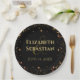 Estes pratos divertidos vão tornar a sua recepção de casamento bonita. Projetados como parte da nossa Suite de Casamento Shimmering Sparkles, eles apresentam um elegante, porém branco, design de estrelas rosa e douradas com texto dourado sobre fundo preto.