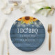 Luzes bonito de cordas e girassóis decoram seus detalhes especiais de celebração de festas de noivado, dispostos em tipografia elegante sobre um fundo azul de madeira rústica. Projetado por Thisnotme©