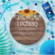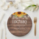 Lindas luzes de corda e girassóis decoram os detalhes da celebração da sua festa de noivado em tipografia elegante em um fundo de madeira rústica. Projetado por Thisisnotme