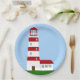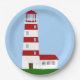 Farol em listras vermelhas e brancas com a casa sobre fundo azul