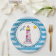 Chapas de papel com tema náutico. Concebidos com um padrão de risca azul e um círculo náutico azul colocado sobre o topo. Um farol listrado vermelho e uma bola de praia, com um sol sorridente e uma gaivota na distância posicionada dentro do quadro.