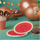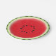 Esta placa é uma melancia suculenta, metade com courato, sementes e buracos de sementes. Uma lâmina de pele listrada é visível no bordo.