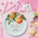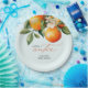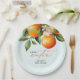 Little Cutie Orange Clementine Chá de fraldas Favor Paper Plates apresenta um belo buquê de laranjas aquáticas e flores junto com um elegante tipo de caligrafia.