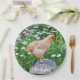 Estas placas de aniversário de galinha apresentam um lindo frango Buff Orpington parado em um muchão de madeira cercado por um jardim de margaridas.