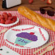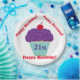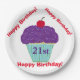 Pratos de festa descartáveis Feliz Aniversário de 21 anos. Personalize para qualquer idade, insira um nome ou deixe em branco. Deliciosos Cupcakes de Baunilha com Cobertura Roxa e Cereja Vermelha em cima com Embrulho de Cupcake Pleated Azul Claro. Feliz Aniversário está escrito em vermelho em um fundo branco. Personalize para Qualquer Idade. Arte Original de TamiraZDesigns.