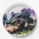 Feliz aniversário, Monstro do Monstro do Batedor de Smash Crash Boy Paper Party Plates mostra um caminhão de monstro de aquarela dirigindo pela terra. Perfeito para as comemorações da festa de aniversário infantil. Projetado pelo Evco Studio. Para obter informações sobre a coordenação de itens, consulte www.zazzle.com/store/evcostudio