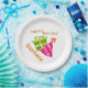Feliz aniversário, placas de papel personalizadas e artigos de festa de aniversário, com uma fotografia de um chapéu cor-de-rosa e um presente verde embrulhado com cartazes verdes e cor-de-rosa desejando um Feliz Aniversário.