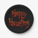 Texto "Feliz Assalto" em letras laranja espectrais, com alguns olhos fantasmagóricos, um design humorístico para um Halloween assombroso