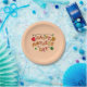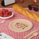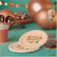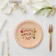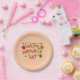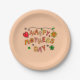 Dia de as mães feliz é escrito em letras maiúsculas, cercado por um grande coração vermelho e uma flor amarela em um longo caule verde. Esta cor de fundo é pêssego profundo.