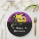 Esta placa divertida e assustadora apresenta uma bruxa bonita ao lado de uma casa assombrada. Ao fundo está uma lua de cheio com morcegos e um céu noturno roxo com estrelas. Isto é perfeito para uma festa de Halloween.