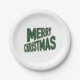 Estas placas exibem as palavras "Feliz Natal" em uma fonte impressão a negrito mais letras verdes contornos vermelhos com letras de tamanho diferentes no plano de fundo neste tema e estilo de X-mas. As placas vêm num conjunto de oito e são impressas em excelente de papel durável para servir bolo, aperitivos ou saladas. Todas as placas são aprovadas pelo FDA para contato com comidas e segurança totalmente biodegradáveis e impressas com tintas à base de vegetais impressas nos EUA.